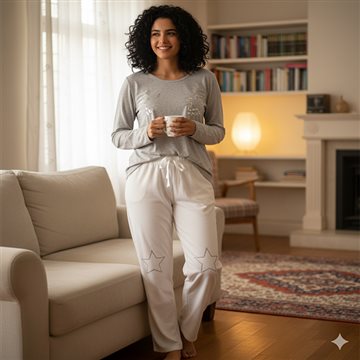 آلمان جنس بلوز 100 در صد پنبه جنس شلوار 100 پلیاستر شلوار گرم و بسیار لطیف بسیار لطیف برای پوستهای حساس رنگ بلوز خاکستری - رنگ شلوار شیری شستشو و اتوکشی از داخل، از شوینده مخصوص لباسهای رنگی استفاده کنید دارای استاندارد